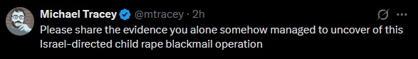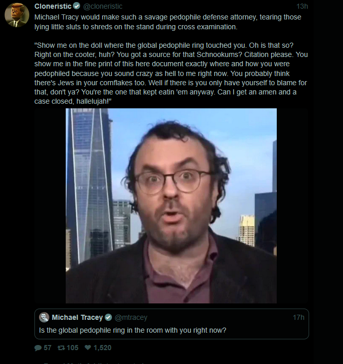 @internetfreak@TerryHe is still going on to this day. What Michael "epstein top guy" Tracey really want is an email saying "I Donald J Trump put my dick in to a 9 year old kid (with pictures)" The guy is a nutbag