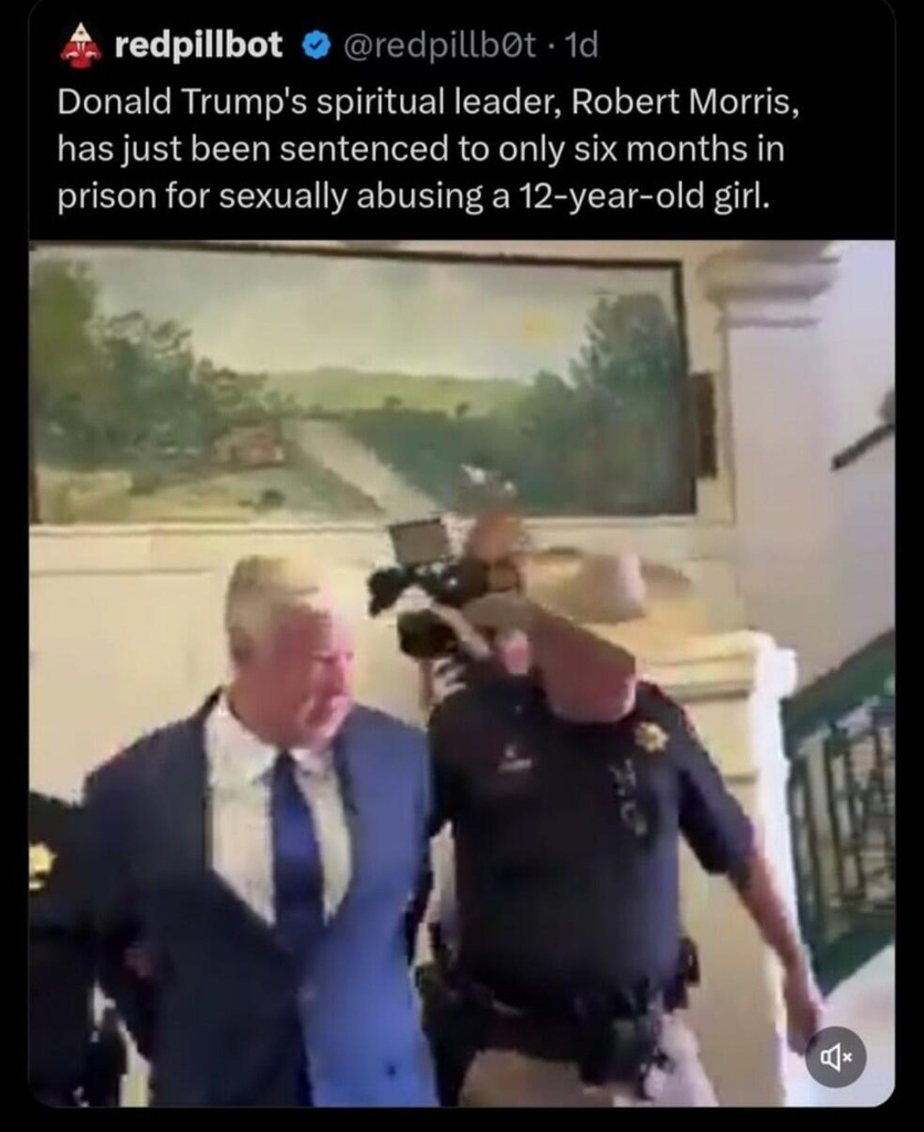 The information in the image regarding Robert Morris is factual. On October 2, 2025, Robert Morris, the founder of Gateway Church and a former spiritual adviser to Donald Trump, pleaded guilty to five felony counts of lewd or indecent acts with a child.