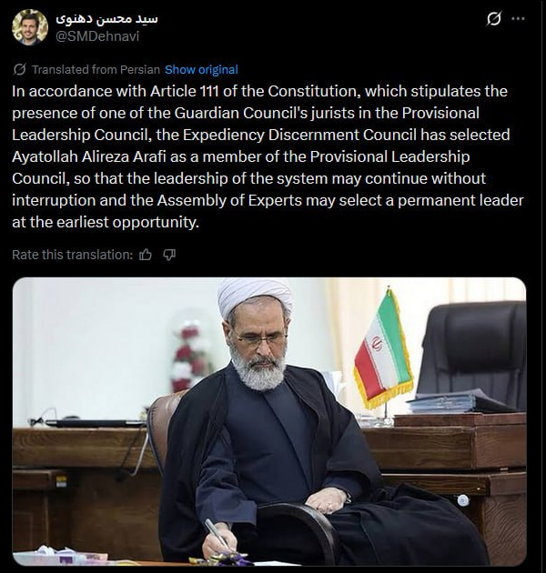 ▪️Arafi will serve alongside President Masoud Pezeshkian and Chief Justice Gholamhossein Mohseni-Ejei on the Interim Council.