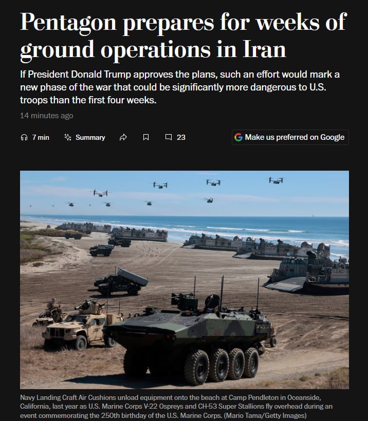 The Pentagon is preparing for weeks of ground operations in Iran, according to WaPo.