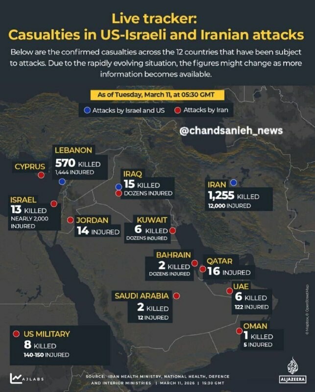 Al-Jazeera: Iranin sodan uhrien määrä 11. maaliskuuta 2026 maiden ministeriöiden mukaan #Iran: 1 255 kuollutta, 12 000 haavoittunutta Libanon: 570 kuollutta, 1 444 haavoittunutta #Israe...