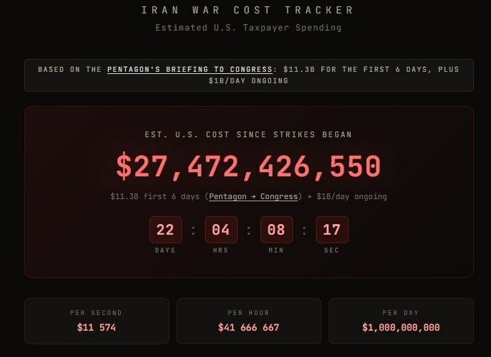 САД су већ потрошиле преко 27 милијарди долара на војну операцију против Ирана. Ово је процена коју је дао ресурс за праћење War Cost Tracker. Прорачун се заснива на подацима Пентагона, првих шест дана сукоба коштало је 11,3 милијарде долара