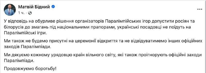 will partially boycott the Paralympic Games because athletes from and were allowed to participate. Minister of Sports Matvei Bedny called the decision to allow their participation "outrageous". "Ukrainian officials will n