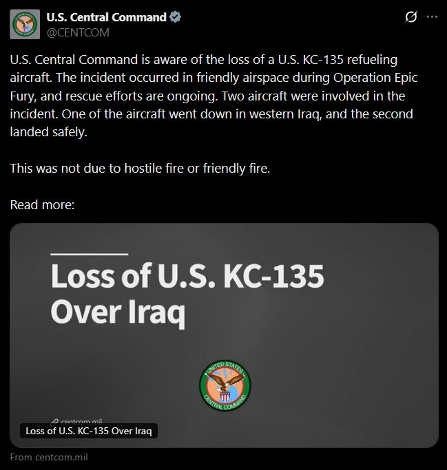 🇺🇸🇮🇶 CENTCOM sanoo kadottaneensa ilmatankkerin jossain Länsi-Irakin yllä. "Ei ystävällisen eikä vihollisen tulen." Uskommeko heitä? 🔗 Liity seuraamme | @MyLordBebo