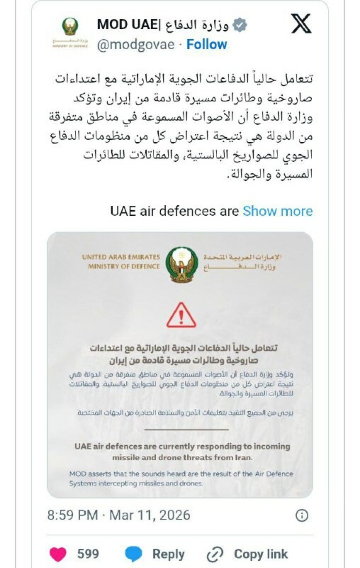 🇦🇪💥🛸Yhdistyneiden arabiemiirikuntien puolustusministeriö on ilmoittanut, että maan puolustusvoimat taistelevat parhaillaan Iranista laukaistuja droneja ja ohjuksia vastaan. 🔴@DDGeopolitics