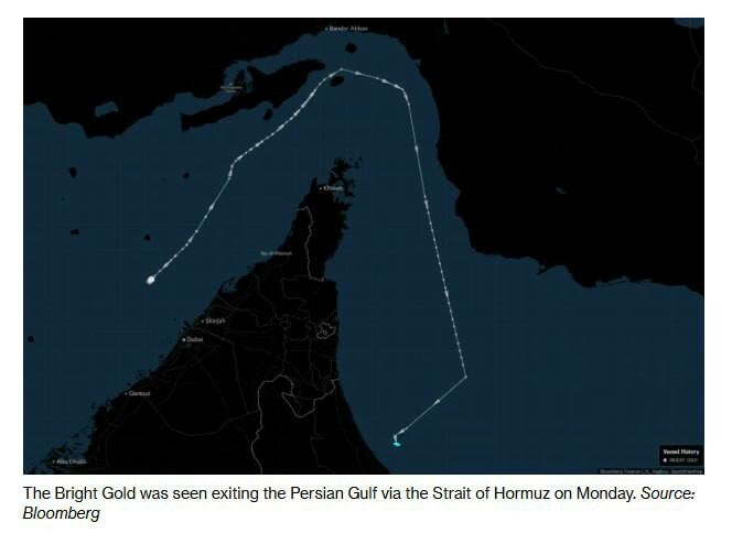 Кинески танкер за гориво, „Bright Gold“, прошао је кроз Ормуски мореуз користећи руту дуж иранске обале коју је одобрио Техеран. Пловио је између острва Кешм и Ларак и сигнализирао да је у кинеском власништву.