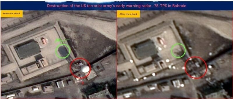ИРГЦ објављује сателитске снимке који приказују уништење кључних америчких радара у Бахреину. Наводно су погођени радар за контролу ватре Patriot AN/MPQ-65 и радар за рано упозоравање TPS-75.