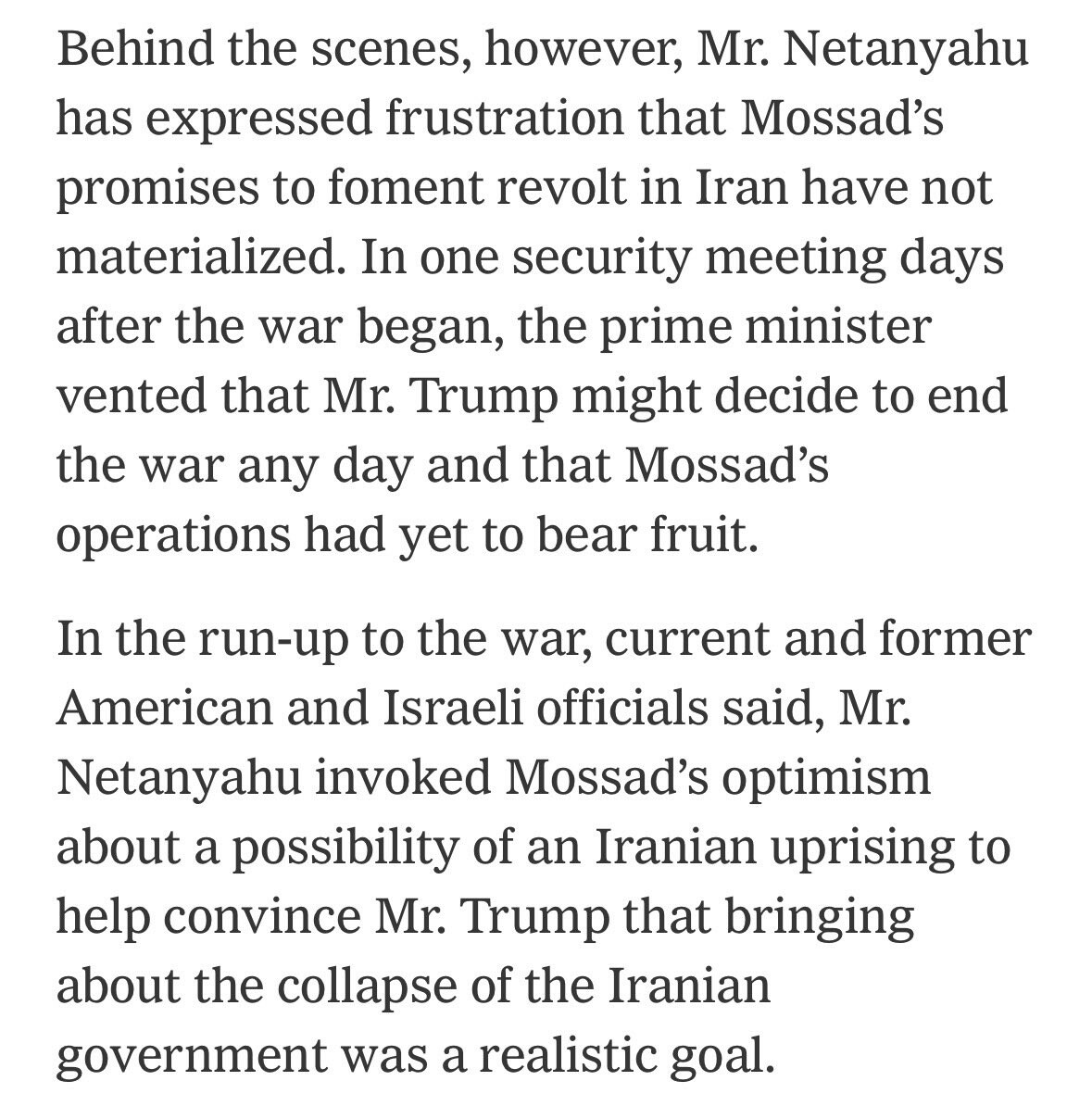 >Within days of the war’s beginning, said David Barnea, the Mossad chief, his service would likely be able to galvanize the Iranian opposition — igniting riots and other acts of rebellion that could even lead to the collapse of Iran’s government. Mr. Barnea also presented the proposal to senior Trump administration officials during a visit to Washington in mid-January.
