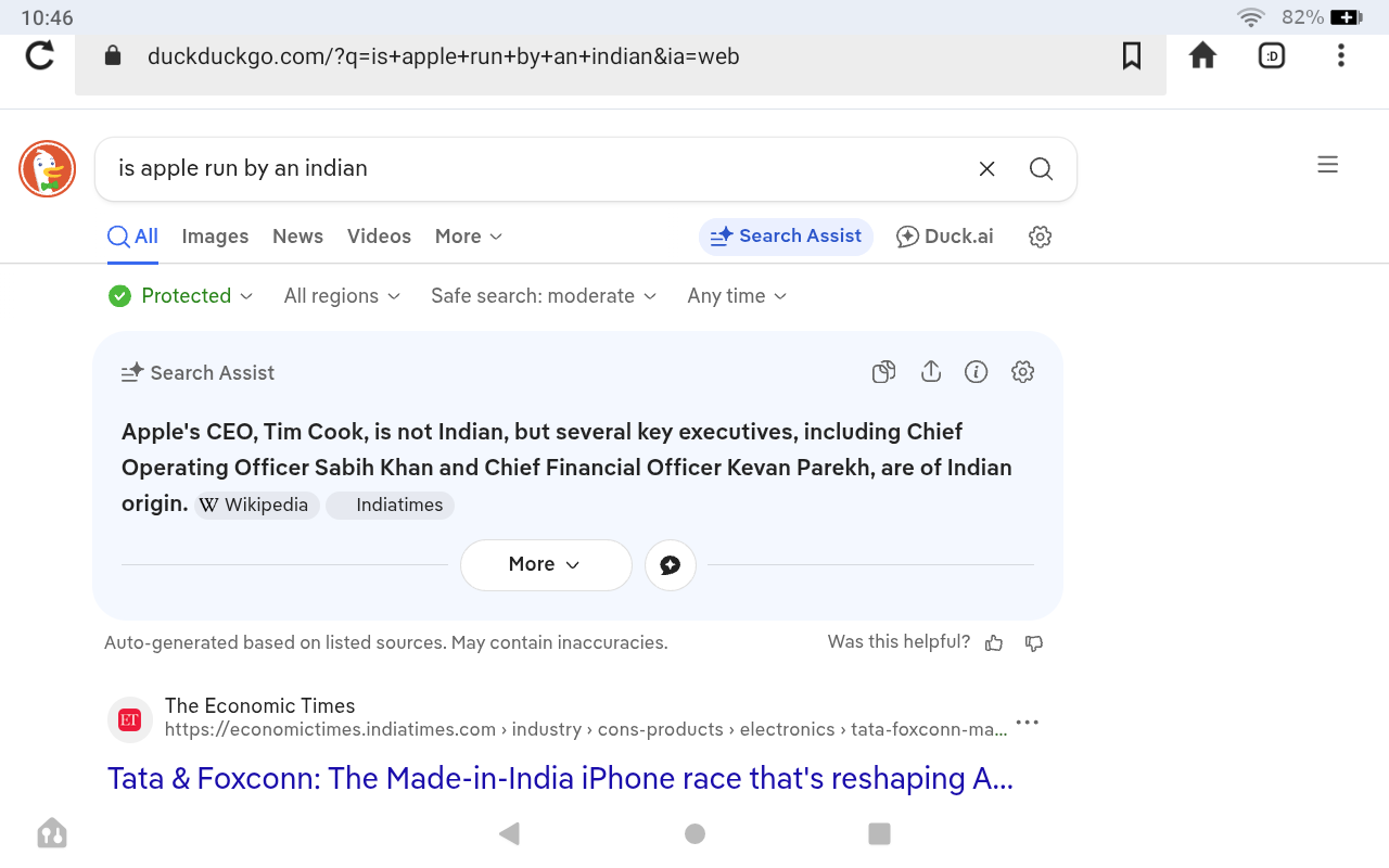 Duckduckgo search assistant claims key members of apple are Indian
