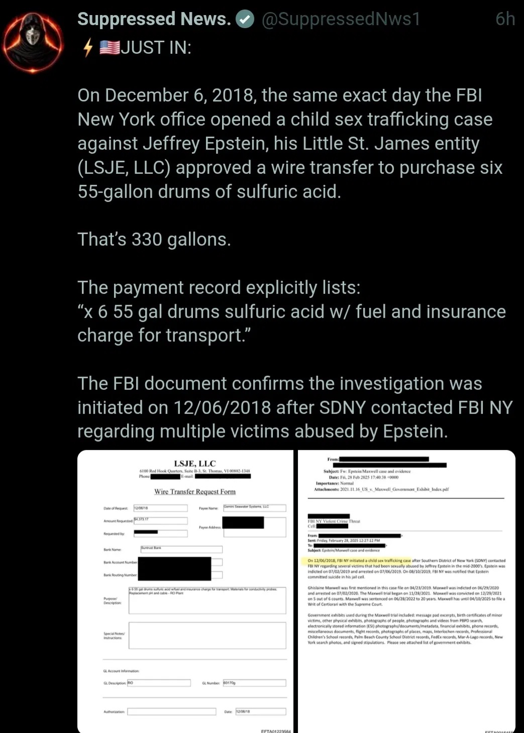 Article: “On December 6, 2018, the same exact day the FBI New York office opened a child sex trafficking case against Jeffrey Epstein, his Little St. James entity (LSJE, LLC) approved a wire transfer to purchase six 55-gallon drums of sulfuric acid…”
