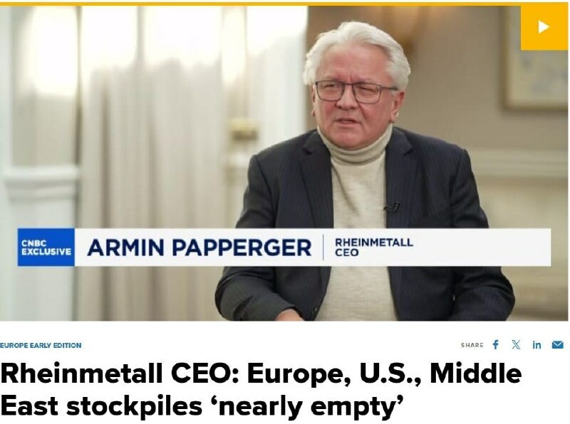 Шеф немачког одбрамбеног концерна Армин Папергер изјавио је да су светске залихе средстава противваздушне одбране „практично исцрпљене“ због рата на Блиском истоку. О томе је Папергер говорио у интервјуу за CNBC.