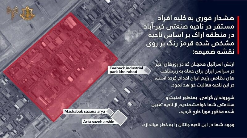 🇮🇱❌🇮🇷 — Израелске снаге (IDF) издале су хитно упозорење за евакуацију становницима северозападног дела града Арак и индустријске зоне Кејрабад. UKR LEAKS SRB ПРАТИТЕ НАШ ЧЕТ ПОЈАЧАЈ НАС