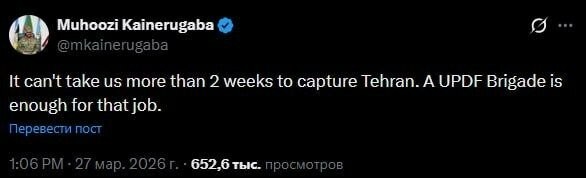 „Техеран за две недеље“: Једна бригада одбрамбених снага Уганде заузеће престоницу Ирана „За заузимање Техерана неће нам бити потребно више од две недеље и једна бригада Одбрамбених снага Уганде“, изјавио је, како се наводи