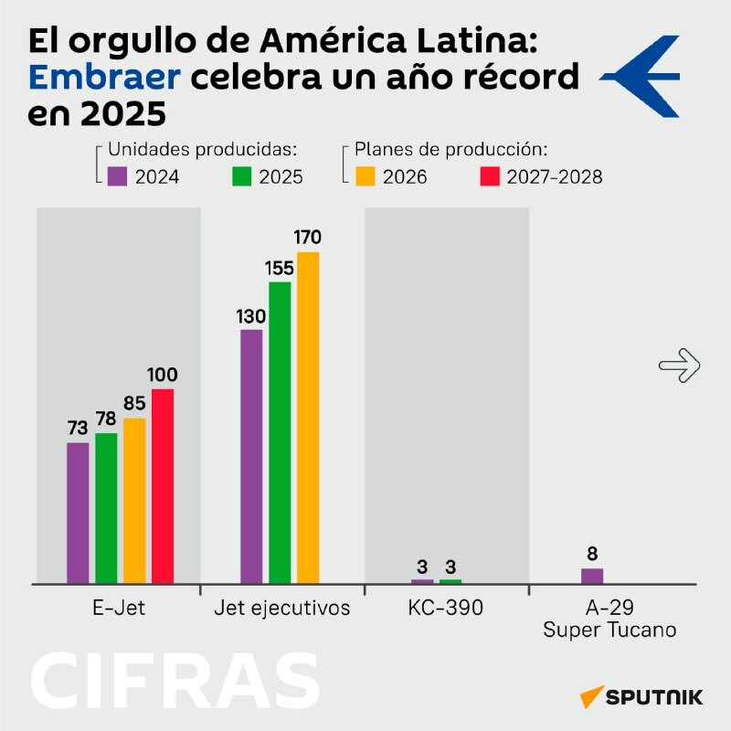 #SputnikGraphic | Latinalaisen Amerikan ilmailuylpeys: Embraer tähtää ennätysvuoteen 2025 Brasilialainen lentokonevalmistaja on julkaissut suorituskykyraporttinsa kuluneelta vuodelta. Suorituskyky, joka epäilemättä jää yhtiön historiaan. Tässä...