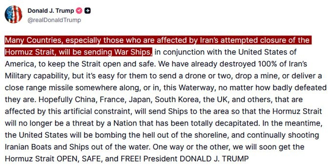 JUURI NYT - #Trump väittää, että "monet maat" lähettävät sotalaivoja Hormuzinsalmeen pitääkseen sen avoimena ja turvallisena yhdessä Yhdysvaltojen kanssa. @disclosetv