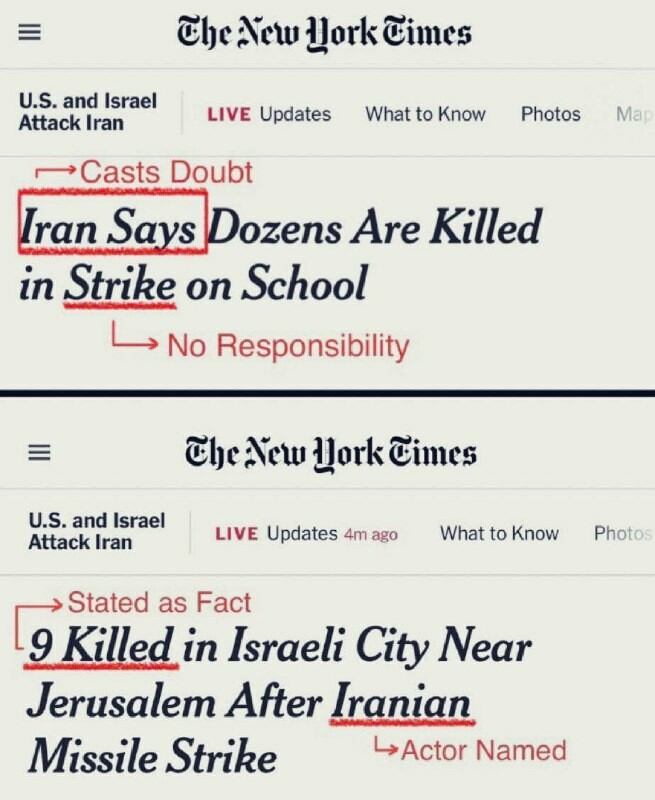 ...aailman sallitaan surra niitä. Sama rätti, joka johti rumpujen tahdissa Bagdadiin, joka painoi Judith Millerin Pentagonin satuja etusivun pyhinä kirjoituksina helpottaakseen tietä Irakille vuonna 2003, opettaa sinulle epistemologiaa kuolleista iranilaisista koulutytöistä. Kysy itseltäsi, jos Israelin ohjukset olisivat kolminkertaisesti osuneet Jerusalemin alakouluun ja tappaneet 165 tyttöä, joiden matematiikan kirjat ovat yhä auki pulpeteilla, lukisiko otsikossa "#Israel sanoo?" Tiedät vas...