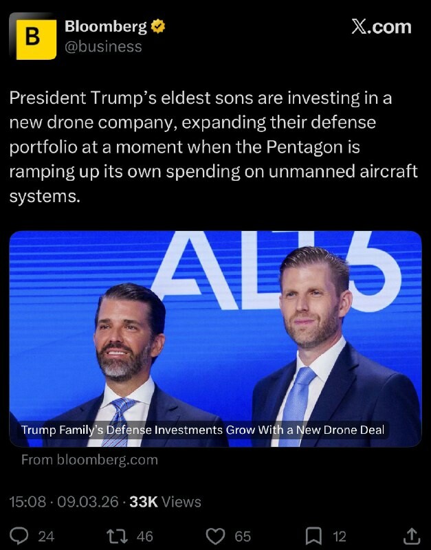 Juuri kun Yhdysvallat tarvitsee droneja ja torjuntalennokkeja... Trumpit investoivat drone-yritykseen. 🔗 Liity mukaan | @MyLordBebo