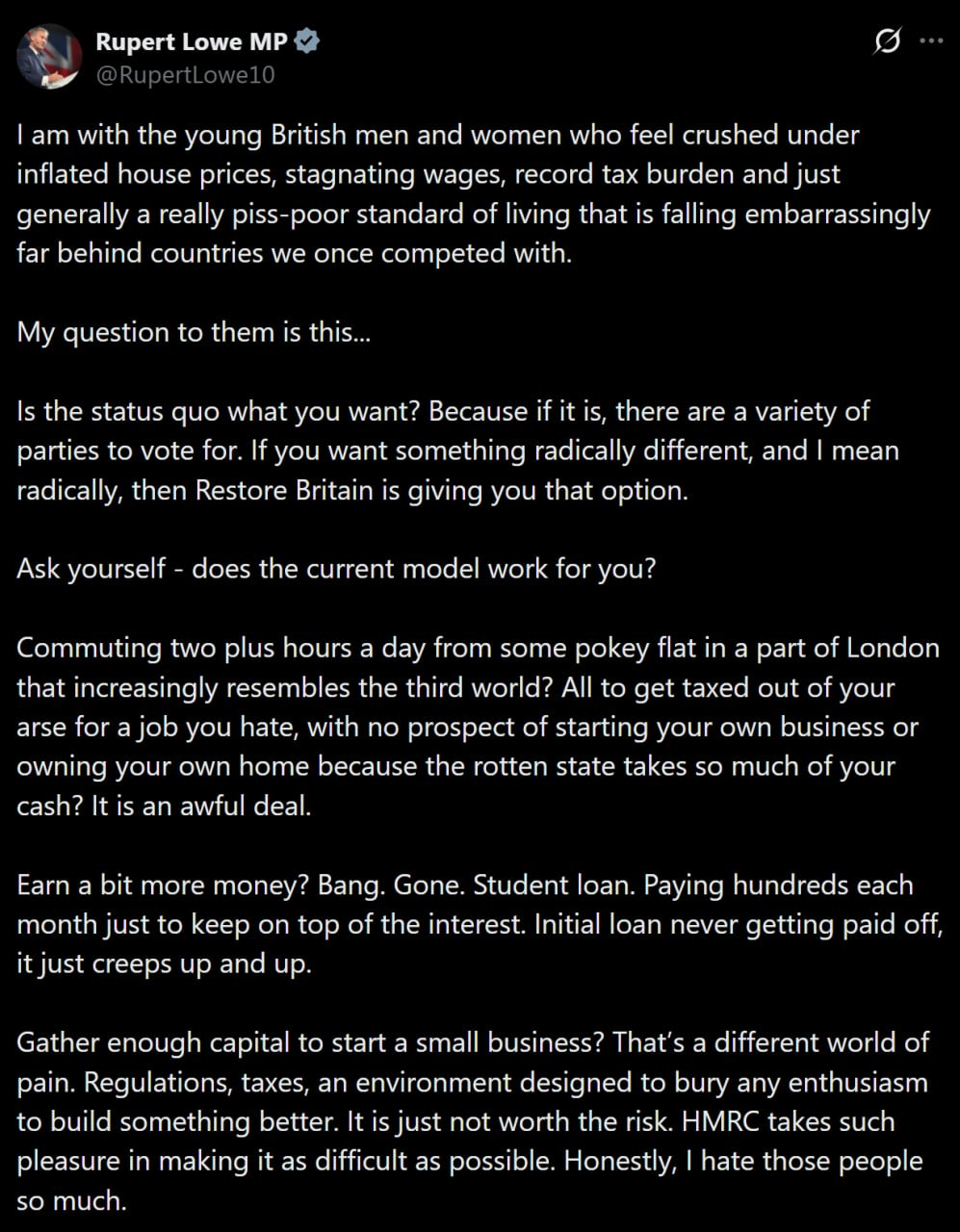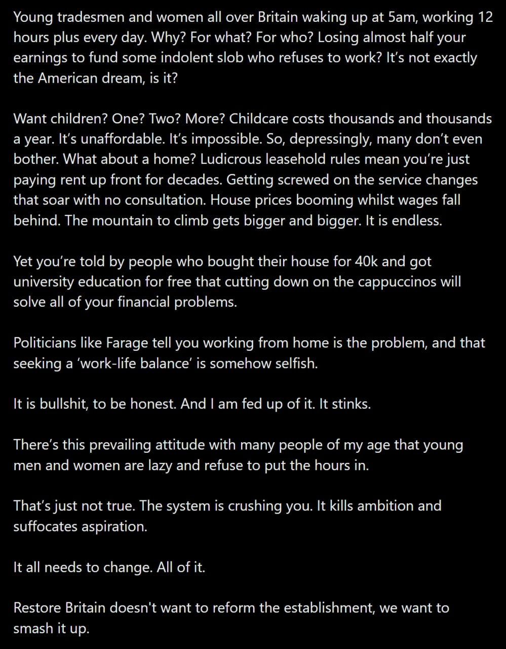 "I am with the young British men and women who feel crushed under inflated house prices, stagnating wages, record tax burden and just generally a really piss-poor standard of living that is falling embarrassingly far behind countries we once competed with."