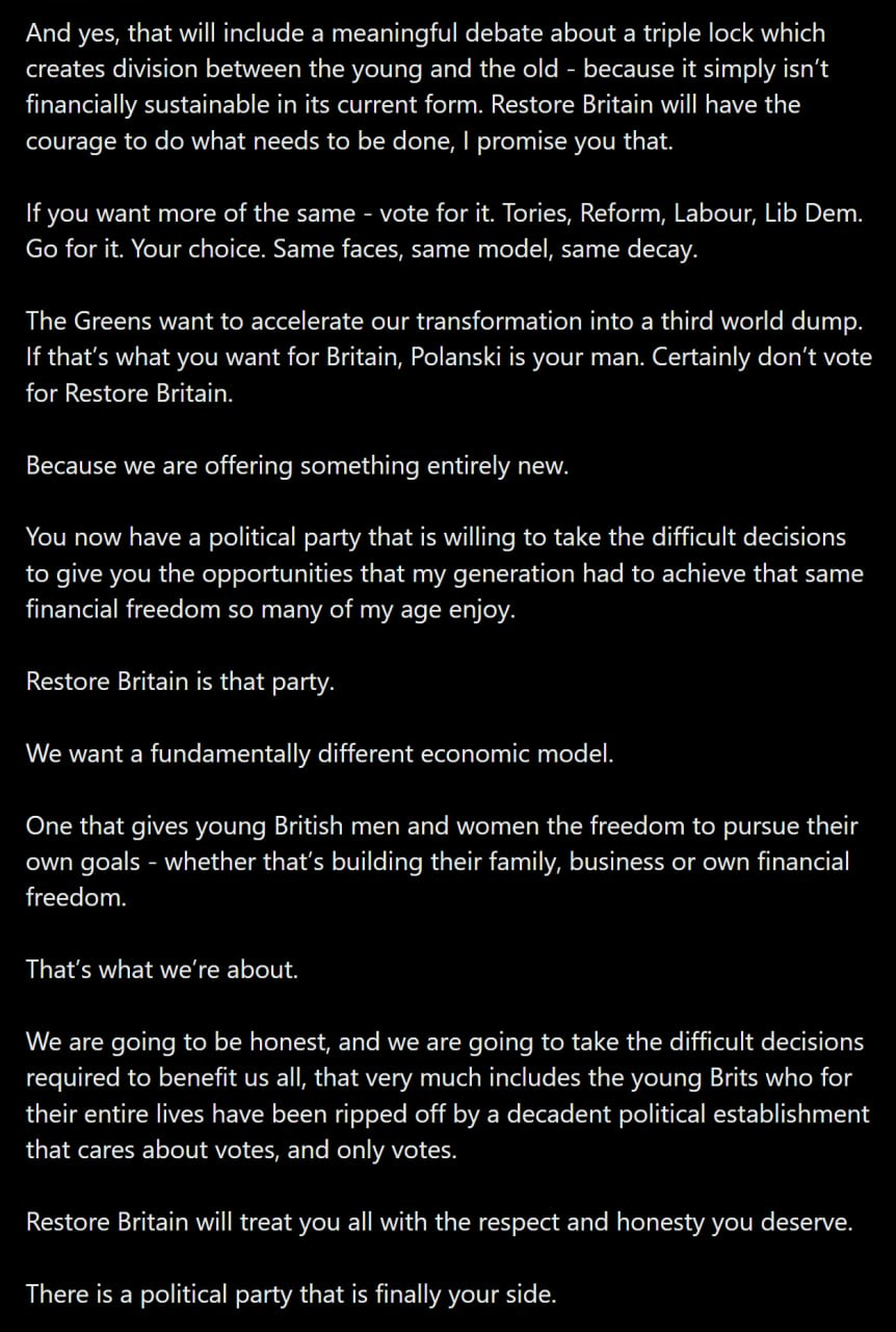 "Restore Britain is the party for young British men and women who are treated like a piece of dirt on the shoe. We will cut your taxes, enable you to buy a home, help you to raise a family and deport the third world sex pests harassing you in your towns. We are on your side."