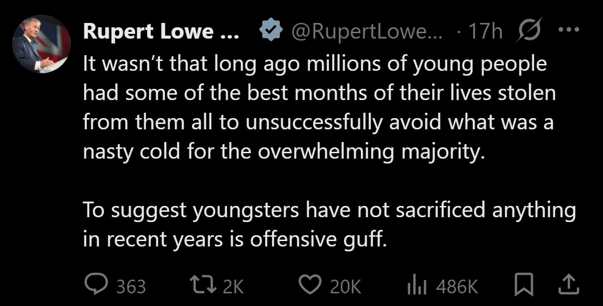 "It wasn’t that long ago millions of young people had some of the best months of their lives stolen from them all to unsuccessfully avoid what was a nasty cold for the overwhelming majority. To suggest youngsters have not sacrificed anything in recent years is offensive guff."