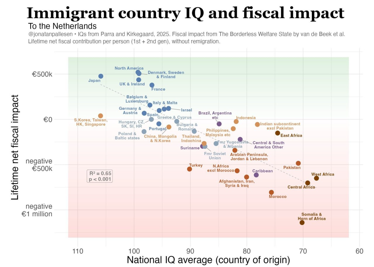 National average IQ vs. lifetime net fiscal contribution per migrant (Dutch data):