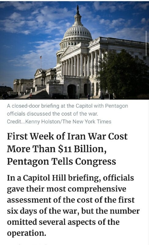 🇺🇸 Pentagonin arvion mukaan Iranin vastaisen sodan ensimmäiset kuusi päivää maksoivat Yhdysvalloille yli 11,3 miljardia dollaria - NY Times.
