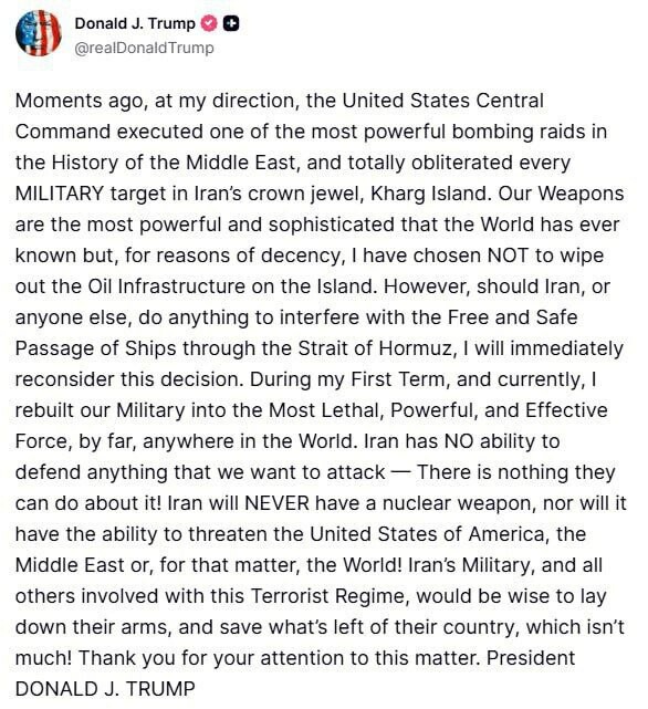 Trump antoi yöllä Irania koskevan lausunnon: Muutama minuutti sitten Yhdysvaltain keskuskomento toteutti käskystäni yhden Lähi-idän historian voimakkaimmista pommituksista ja tuhosi täysin kaikki sotilaskohteet Iranin helmellä - Khargin saarella....