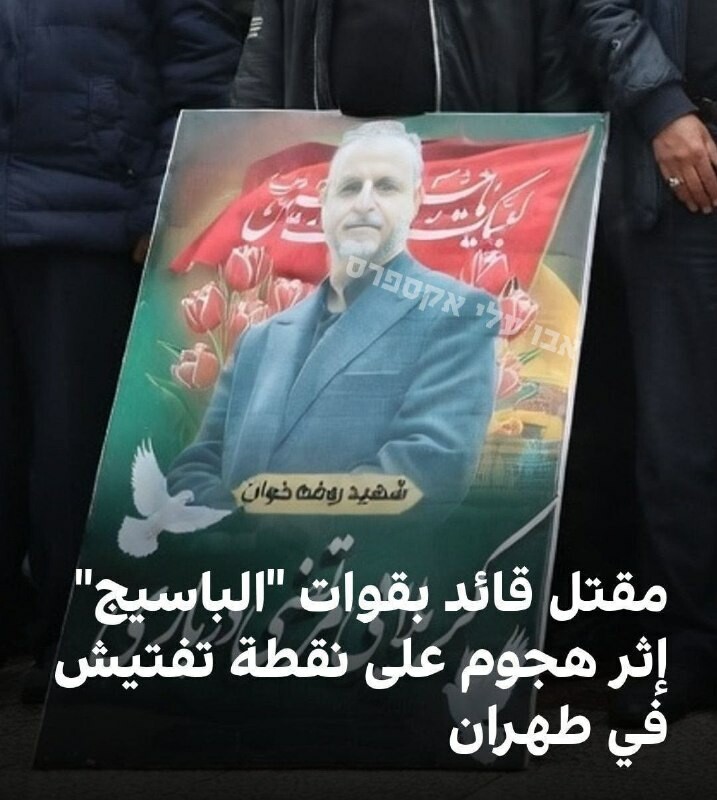 Иранска новинска агенција Тасним (повезана са режимом): Мортез Дарвари, командант базе Басиџ, Ибн Акил ал-Муслими у џамији Аман Заман, елиминисан је у нападу на Друмску контролну тачку у четвртом Ашмебаду у 15. округу Техерана. Израел користи н...