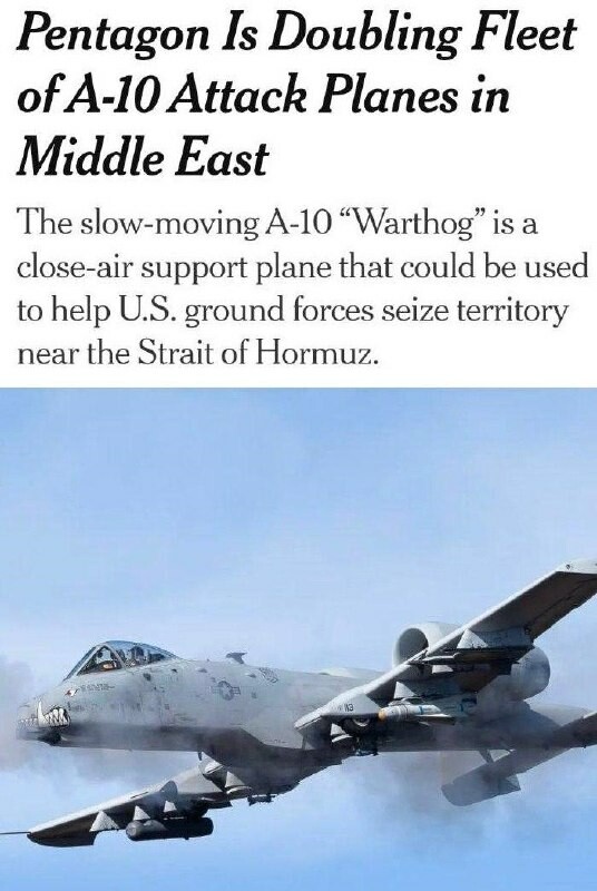 Pentagon zdvojnásobuje počet útočných letounů A-10 na Blízkém východě, uvedl NYT. Úřad oznámil, že do regionu vysílá dalších 18 letounů. Připojí se k těm, které již byly použity k útokům na Írán. A #Trump prohlásil