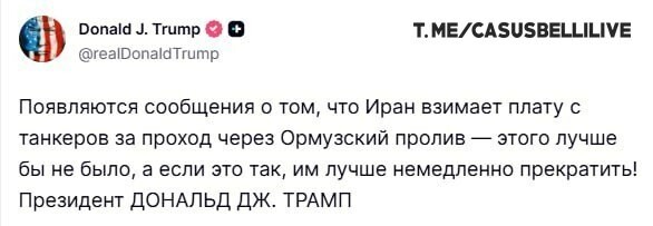#Trump spustil hysteriku a zakazuje Iránu brať peniaze od tankerov v Hormuzskom prielive „Objavujú sa informácie, že Irán si účtuje poplatky od tankerov prechádzajúcich Hormuzským prielivom. Bolo by lepšie