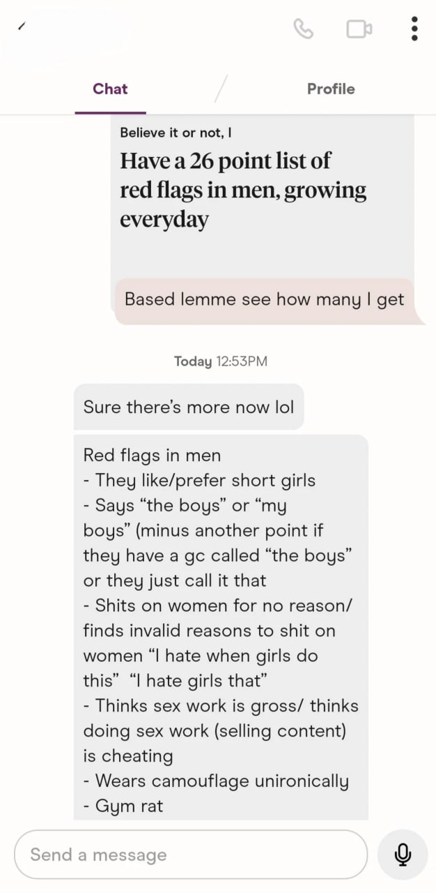 @WashedOutGundamPilot at least half of these are not real problems or are in fact good traits. There is nothing wrong with a man having distaste for prostitution, not being a faggot by not putting in pronouns, or liking sports and exercise. Such "red flags" are really her red flags for seeing these things as problems.