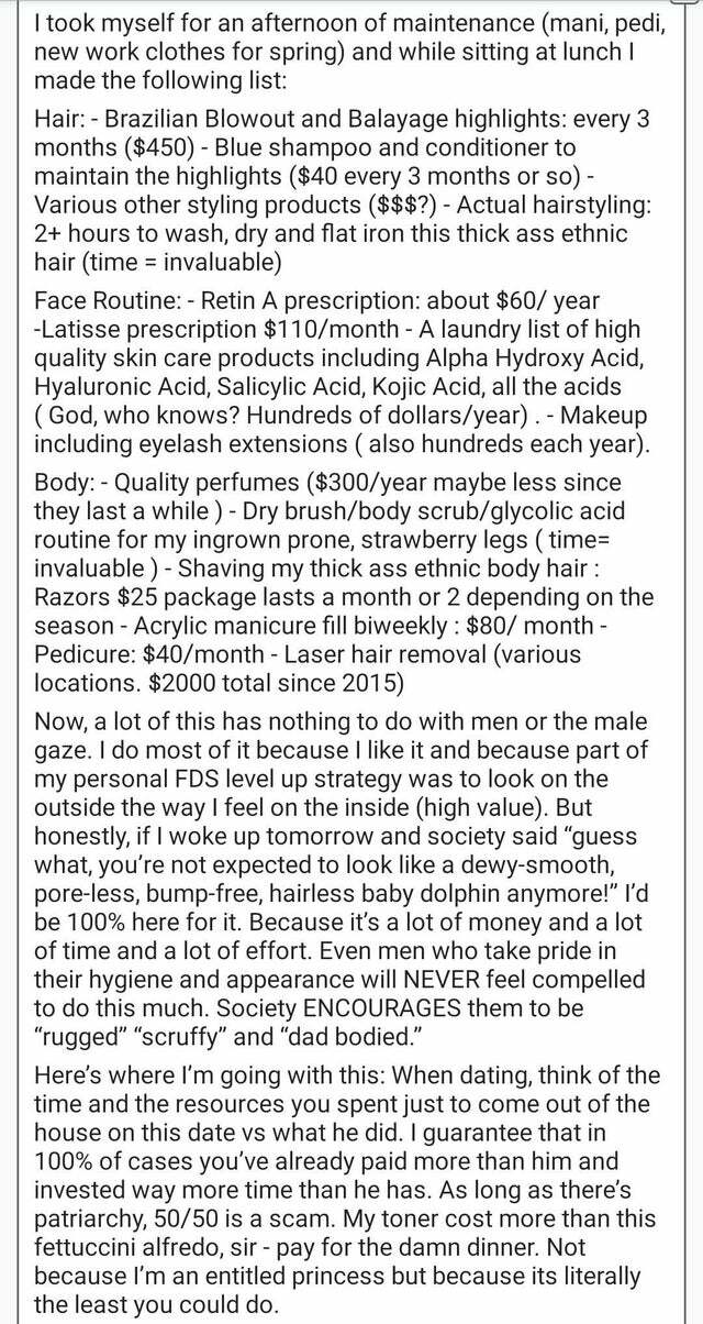 @WashedOutGundamPilot Men like me neither desire nor demand a woman to do the vast majority of this bullshit she calls "self care." A proper diet and exercise is much cheaper and will accomplish 90% of what a man will want in a woman looks-wise. Hell, this woman even admits she does most of this for herself. So no, your expensive hair, skin and nail products/services are not contributing to the date at all.