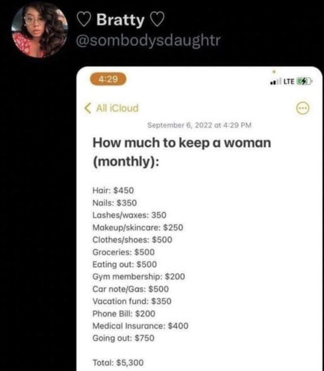 Worth noting that this is less totally serious and more like a woman peacocking to her friends, pretending she’s been able to demand this kind of thing. It’s not too uncommon in girl circles. They all love telling each other they’re expensive women guys are dying to pay for.