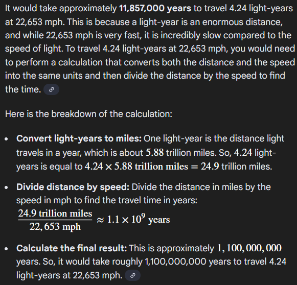 It would take approximately 11,857,000 years to travel 4.24 light-years at 22,653 mph