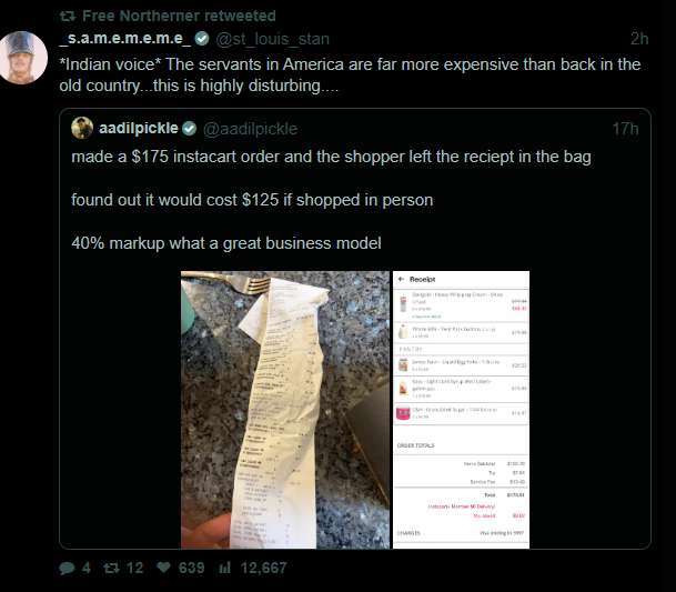 @sickburnbro when you are paying extra money for the delivery of groceries or take-out, the extra cost is not simply how much it costs for someone else to do the work for you. You are also paying for the convenience of not having to go there yourself.