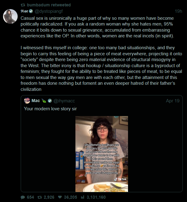 @bonifartius @sickburnbro women who end up in situationships do so through their own fault. They scoffed at the very idea of requiring a commitment before sex (as seen with their distaste to men preferring virgins for marriage), and now they are suffering the consequences of the very thing they were warned against.