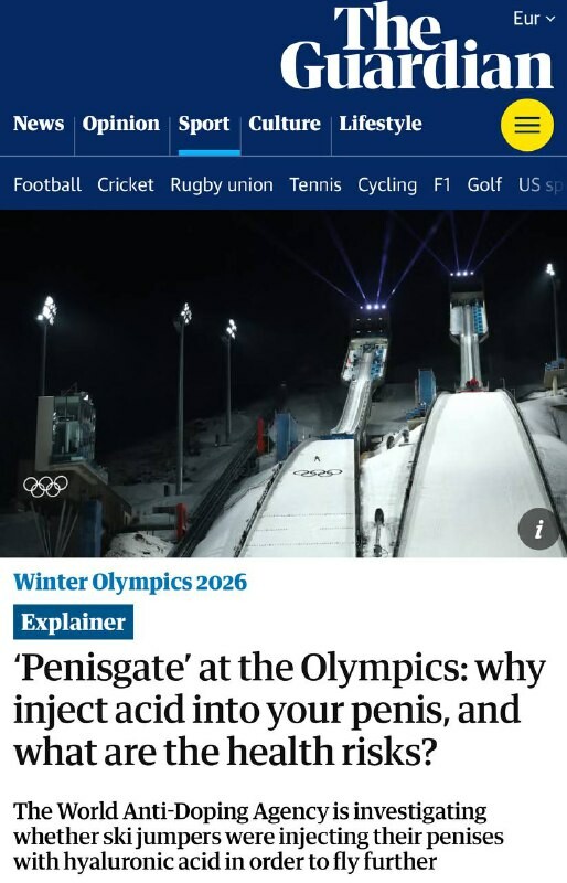 Milanon olympialaiset alkoivat «Penisgaten» laukaisemalla skandaalilla Mäkihyppääjiä syytettiin hyaluronihapon ruiskuttamisesta penikseen. Daily Mail selittää, että 2 cm:n peniksen pituuden kasvu lisää hypyn pituutta 5,8 metriä. Näin aerodynamiikk