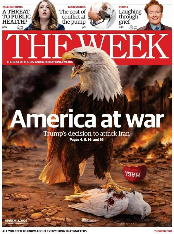 . „Amerika ve válce“. A nejen holub míru trhaný americkým orlem. Na obálce hoří čepice MAGA. Jeden z článků vydání: „Írán: Odpustí MAGA Trumpovi ‚zradu‘?“ Časopis píše: Ano, bylo by pro Trumpa typické „vyhlásit vítězství“ a „stáhnout se z krvepro...