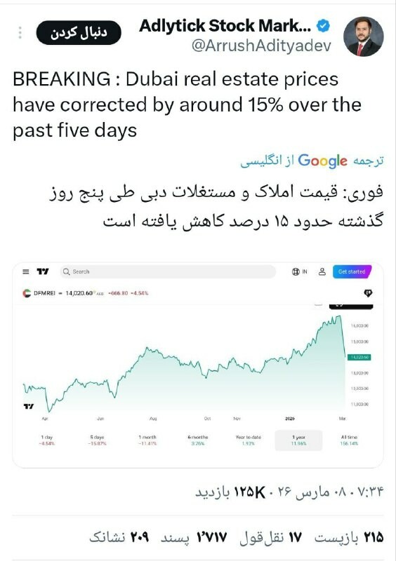 . Americký ekonomický analytik oznámil na sociální síti X, že ceny nemovitostí v Dubaji během pouhých pěti dnů klesly přibližně o 15 %. .