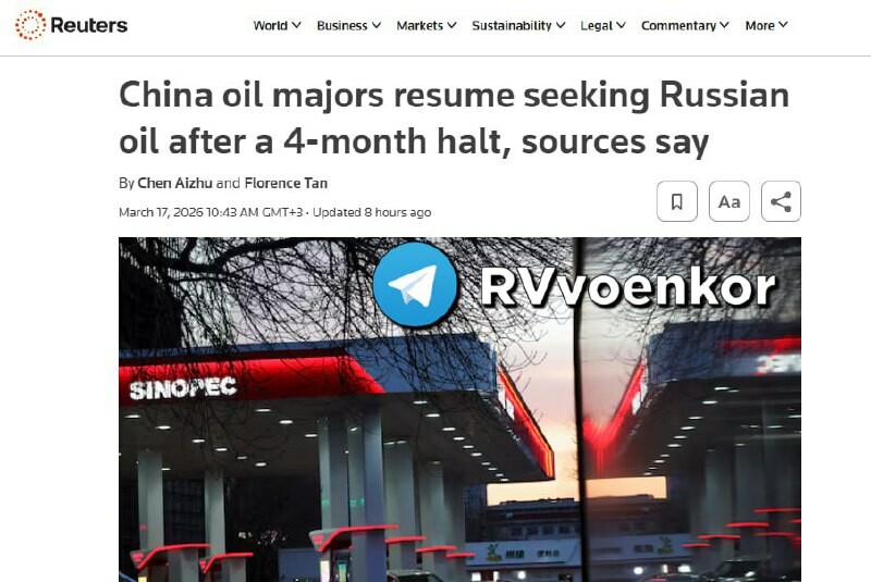 . Největší čínské energetické společnosti připravují obnovení nákupů ruské ropy, — Reuters - Společnosti Sinopec a PetroChina již kontaktovaly dodavatele ohledně možných nákupů. - Navzdory rostoucím cenám v důsledku eskalace na Středním východě je