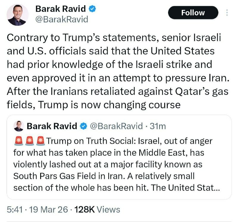 . Reportér Axios: byl o útoku na Jižní Pars informován, ale po íránské reakci to popřel Na rozdíl od Trumpových tvrzení, vysocí izraelští a američtí představitelé uvedli, že Spojené státy o izraelském útoku předem věděly a dokonce s ním
