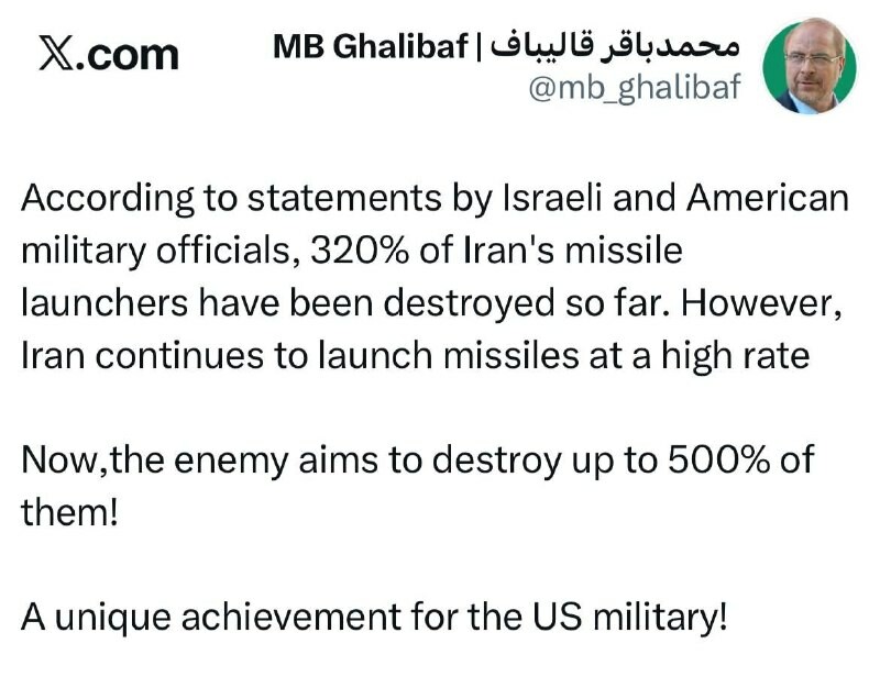 . Podle US tvrzení bylo dosud zničeno asi 320 % íránské raketové kapacity, ale íránské raketové odpaly stále pokračují s nesníženou silou; dnes tvrdí, že zničili už 500%, což je pro americkou armádu opravdu jedinečný úspěch! .