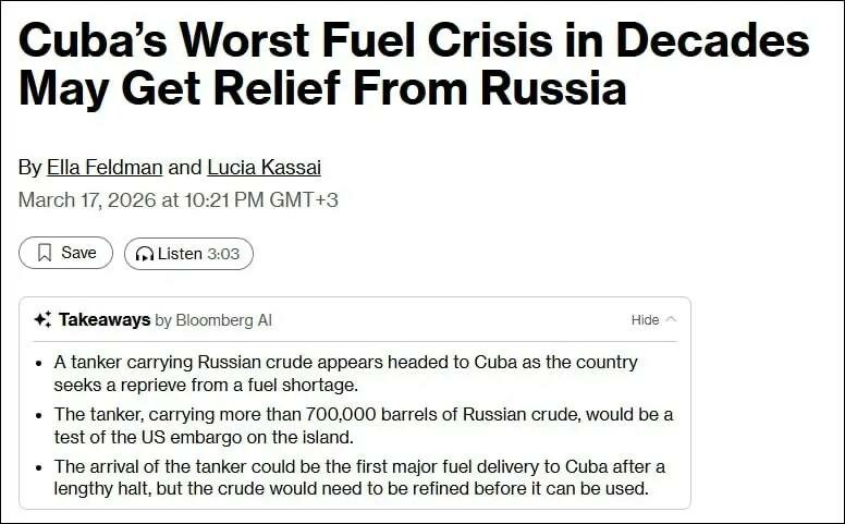 . Tanker s ruskou ropou míří k pobřeží Kuby v době energetické krize a americké blokády — Bloomberg Tanker Anatolij Kolodkin, naložený 730 000 barely ruské ropy, je na cestě do Kuby, která trpí nedostatkem energetických zdrojů.