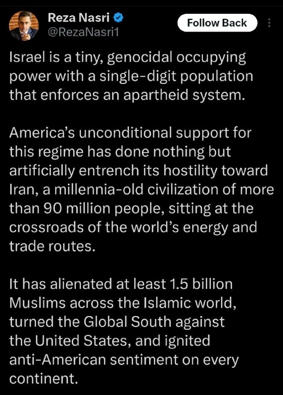 . Reza Nasri, mezinárodní právník, reaguje na Lindsey Grahama, který řekl, že bez Izraele by Amerika neměla bezpečnost: Izrael je malá okupantská a genocidní země s jednociferným počtem obyvatel, řízená apartheidním režimem.