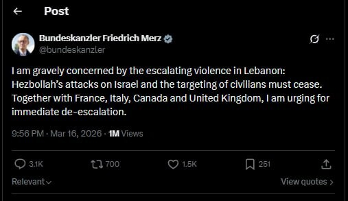 . Po poslední invazi Izraele do Libanonu a vysídlení milionu Libanonců je německý kancléř "velmi znepokojen" útokem libanonského Hizballáh na Izrael.