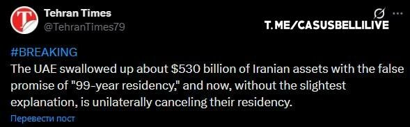 SAE okradli tam žijúcich Iráncov, — Tehran Times SAE zrušili trvalý pobyt všetkým občanom Iránu, vrátane „zlatých“, a prisvojili si ich aktíva. „SAE prisvojili iránske aktíva v hodnote približne 530 miliárd dolárov http://www.casusbelli.live/