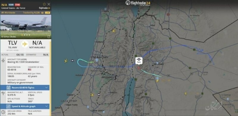 . Americké tankovací letadlo, které vzlétlo z letiště Ben Gurion a kroužilo na obloze nad Jordánskem, vyslalo nouzový signál a vrátilo se do Izraele. .