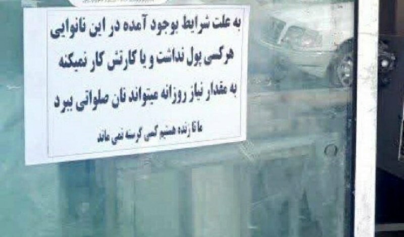 . Nápis na okně pekárny v Íránu: „Každý, kdo nemá peníze nebo jeho karta nefunguje, si může vzít chleba pro svou denní potřebu zdarma. Dokud budeme naživu, nikdo nebude hladovět.“ .