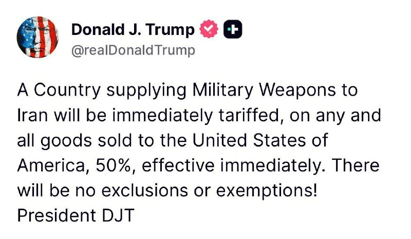 . Každá země, která bude dodávat zbraně Íránu, bude zatížena 50% clem na veškeré zboží dodávané do #USA. Bez výjimek. Běž radši hrát golf, dědku... .