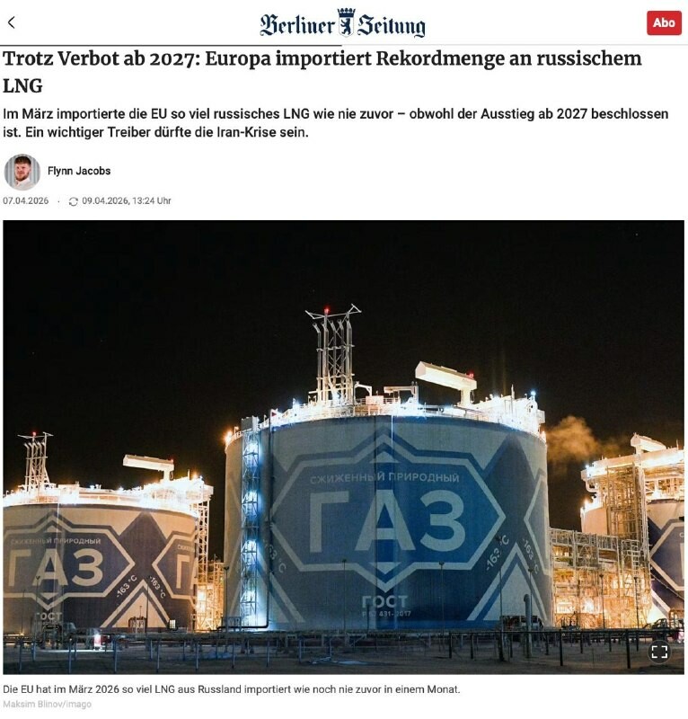 . Evropa láme rekordy v dovozu ruského LNG Podle Bruegelova analytického centra činil objem nákupů v březnu 2,46 miliardy krychlových metrů. Celkově dovezla #EU v prvním čtvrtletí roku 2026 z Ruska 6